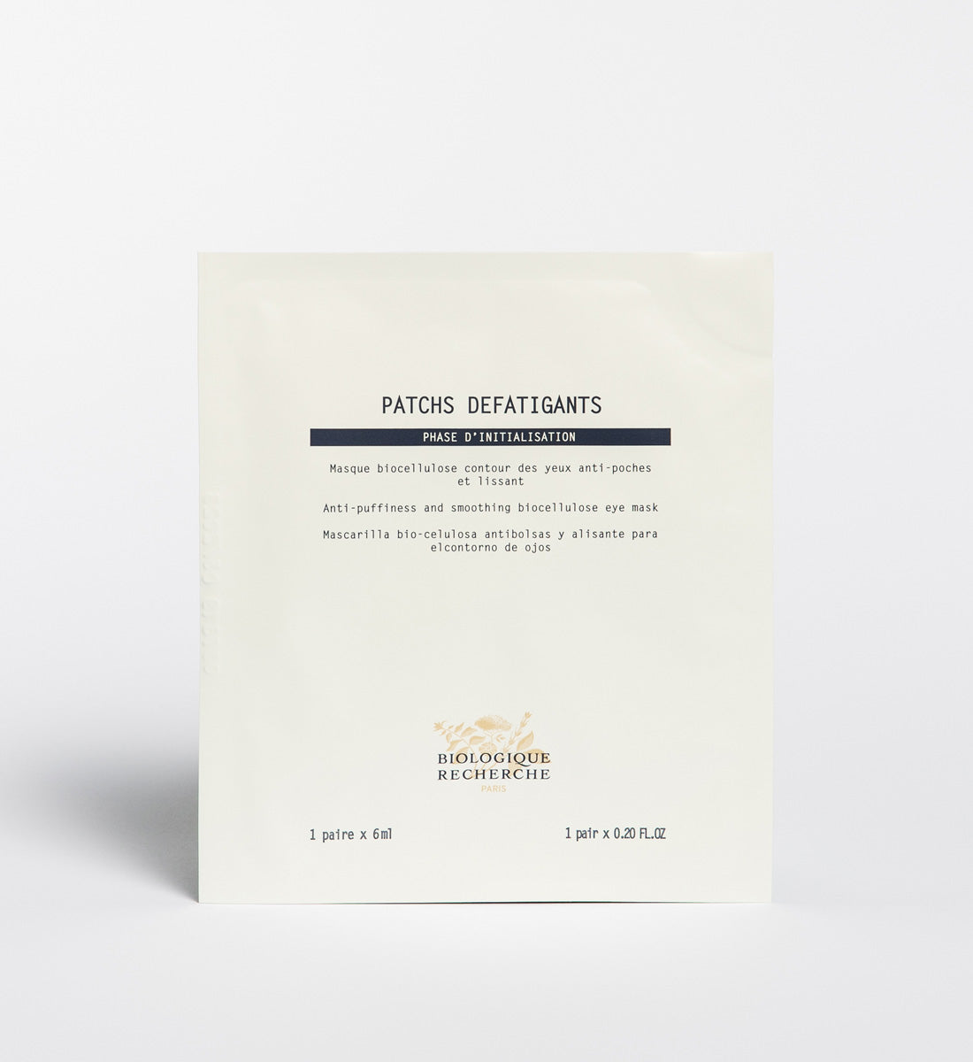 Patchs Défatigants are pre-impregnated with a formula enriched with anti-puffiness, anti-dark circles and anti-wrinkle active ingredients. Its natural biocellulose support and its "pinch"" shape adhere perfectly to the eye contour for a global and effective treatment. Immediately, puffiness is reduced, the skin is smoothed and fine lines are less visible for a rested look. Recommended for treating tired skin with puffiness under the eyes.